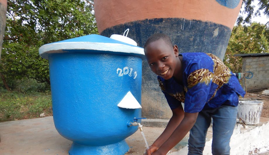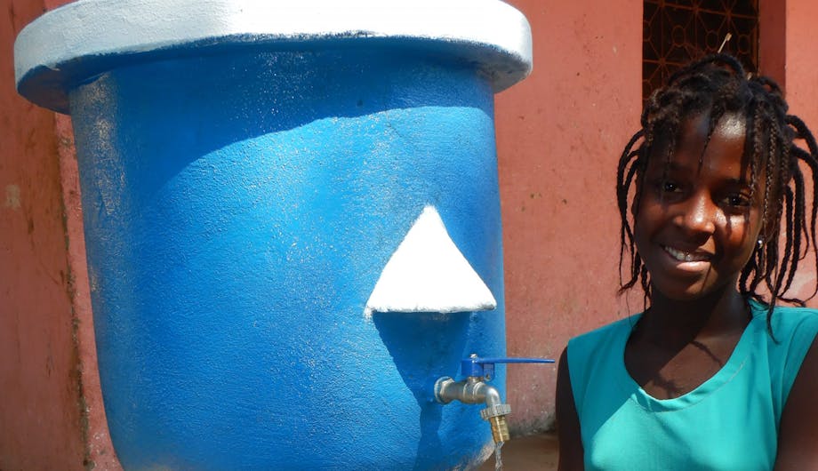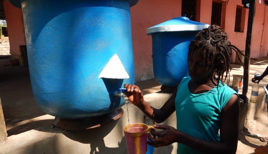 Eenmaal gebouwd, wordt de tank aangesloten op de watergoot van het dak. Het regenwater wordt zo nodig via een filter in de calabash opgeslagen. “Ideaal voor het regenseizoen. Dan vult de tank zich en tijdens het droge seizoen kun je via het kraantje aan de zijkant gemakkelijk elke dag koel water tappen. Een veilige en gemakkelijke watervoorziening.”